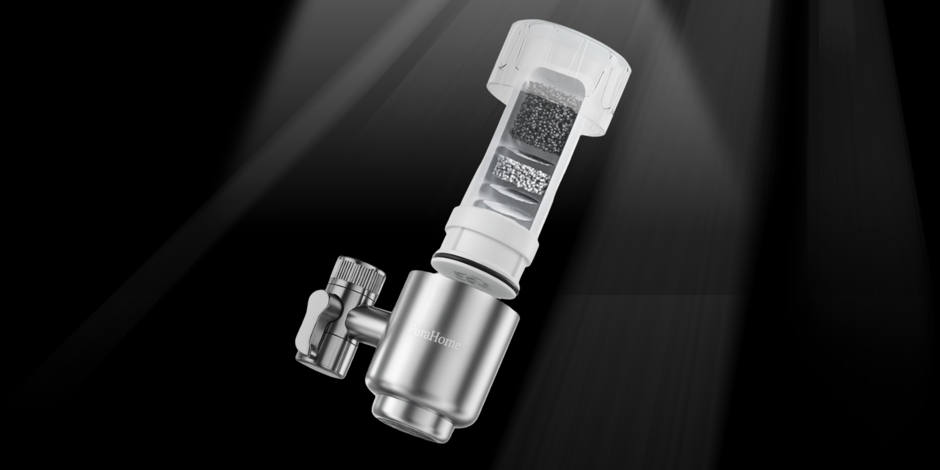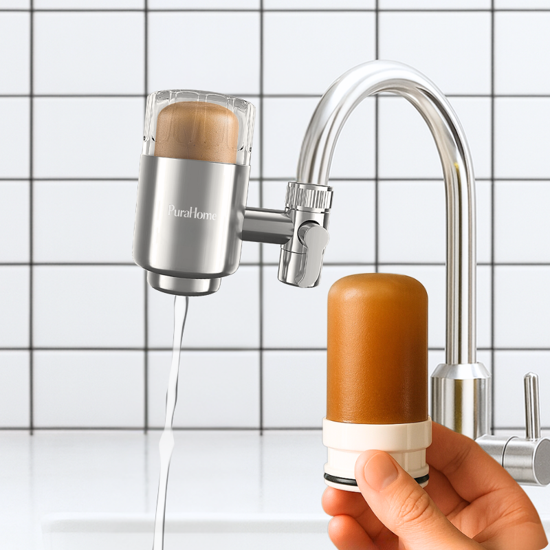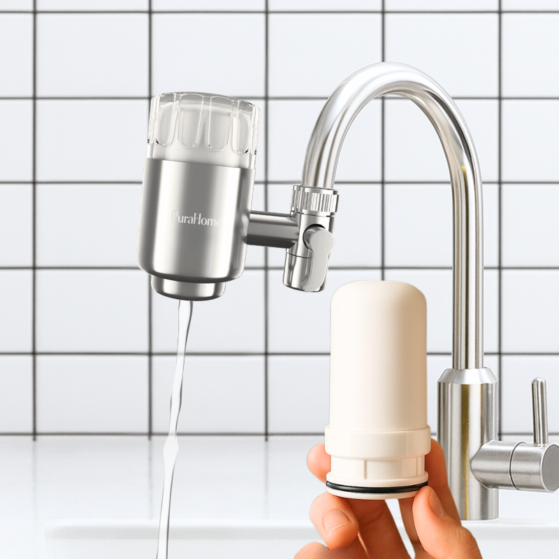 The PuraHome™ Tap Water Filter uses 5-stage Advanced NanoFiltration — powered by natural coconut-activated carbon — to reduce over 100+ contaminants including PFAS, chlorine, lead, microplastics, pesticides, and more.